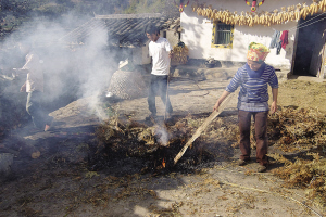 彝家人褪豬毛的方式比較獨(dú)特,不使用開(kāi)水沖燙,而是把豬放在草堆上用火燒,然后再用刀刮去豬毛。草堆被點(diǎn)燃后,豬肉的香氣便彌漫在空氣里。