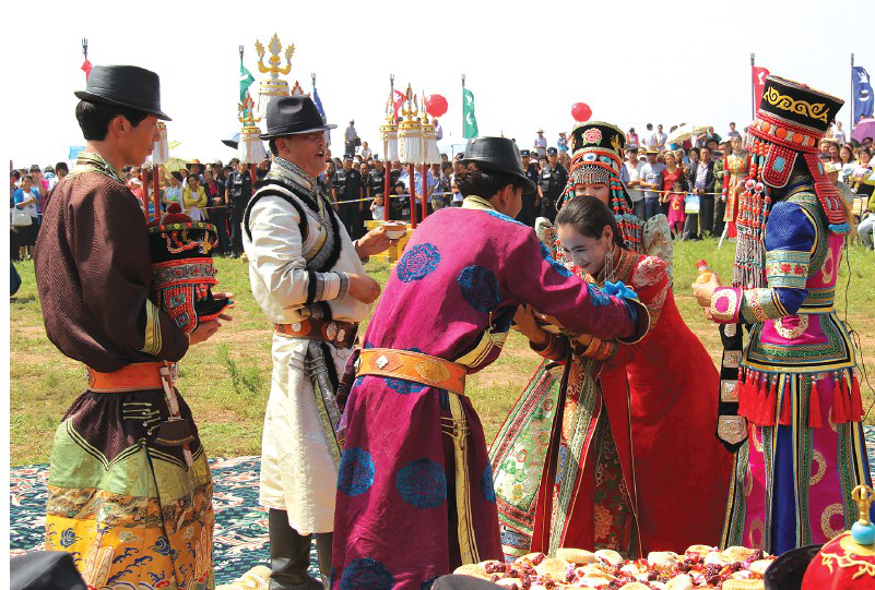 在蒙古民族人生禮儀中,其婚禮儀式最為隆重、熱烈,充滿草原文化綜合特征。蒙古人婚禮習(xí)俗經(jīng)歷了從最早的原始群婚、偶婚到后來一夫一妻婚姻制度的發(fā)展過程。至13世紀(jì),蒙古人的婚禮習(xí)俗已趨完整。《蒙古秘史》載,鐵木真九歲時,其父耶速格巴圖爾(漢書譯作“也速該把禿兒”)帶他與翁吉刺惕的德·薛禪之女勃兒帖定親時就有許多規(guī)矩。