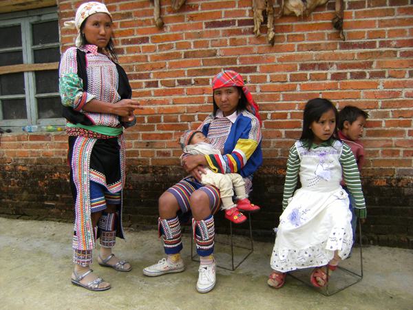 而婦女們的裝束特點分明與眾不同。最突出的是頭戴寬約3公分左右的銀箍,留長發(fā);身著靛青色無領(lǐng)大襟右衽及橫條花筒裙。腰系紅布寬腰帶和數(shù)十根細藤圈。耳掛垂肩圓形大耳環(huán),頸戴銀質(zhì)大項圈,細項鏈。上了年紀(jì)的人,喜歡戴長約五公分傘狀大耳筒,筒頂還刻有各種花紋。有的婦女在耳筒內(nèi)插上香花香草,有的放上人民幣,出門趕集,隨用隨取,很是便利(上下兩圖由劉軍供圖)。