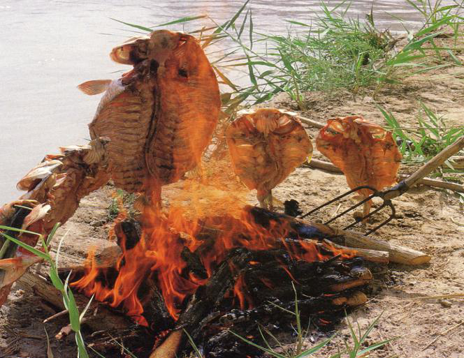 赫哲族居住的三江流域,河流縱橫交錯(cuò),群山環(huán)繞,蘊(yùn)藏著極為豐富的漁獵資源。長(zhǎng)期以漁獵為生的赫哲族人民,在征服自然、改造自然的歷史發(fā)展過(guò)程中形成了具有濃郁民族特色和地域特色的傳統(tǒng)飲食文化。其傳統(tǒng)飲食以漁獵產(chǎn)品為主,魚(yú)干獸肉,家家堆積為糧。這與農(nóng)牧民族相比,別具特色。