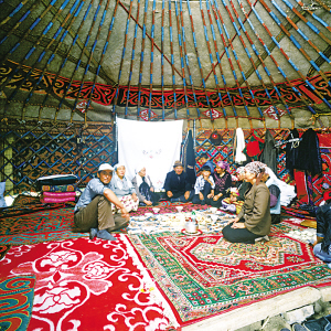 氈房外觀通常樸實(shí)無華,門框由松木做成,上面雕刻花紋或繪制圖案,一塊鮮艷奪目的掛毯吊在門上。房?jī)?nèi)富麗堂皇,布置合理,前半部分堆放日用物品,后半部分待客、住人。