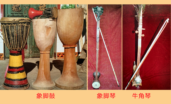 傣劇是在傣族民間歌曲和歌舞音樂的基礎(chǔ)上發(fā)展起來的,并借鑒了漢族戲曲藝術(shù)的表現(xiàn)手段,流傳于德宏、保山、臨滄等傣族聚居區(qū)。傣劇包括多種男女唱腔,男腔多用羽調(diào)式,女腔多用徵調(diào)式。20世紀(jì)50年代以來,傣劇吸收了多種傣族民歌和舞曲,豐富了唱腔,增強(qiáng)了音樂的表現(xiàn)力。傣劇唱腔基本是上下句組成的樂段及其變化反復(fù)。由于唱詞字?jǐn)?shù)可多可少,因此唱腔樂句長短不一。過去,傣劇只用小堂鼓、鑼、镲等伴奏,后逐步采用了多種民族樂器及西洋管弦樂器,組成新型的傣劇樂隊。傣族的民族樂器屬于吹奏樂器的有篳、葫蘆簫(如圖)、豎笛、木葉等;彈撥樂器有玎琴、口弦等;弓弦樂器有西玎(玎琴)、牛角玎(牛角琴)等;打擊樂器有象腳鼓、光隆、光邊、光邦、鑼、镲等。象腳鼓、鑼、镲的合奏是傣族器樂合奏的主要形式。