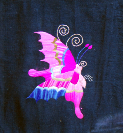 5.拽蜂,是在面料平底上繡制出立體的蝴蝶。由于繡工精細(xì),找不出怎樣連接繡制的地方,好像從布地子上拽出來的蜂,“拽蜂”之得名,古代稱蝴蝶為蜂。