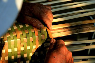 傣族竹編工藝是傣族的傳統(tǒng)工藝美術(shù)形式,歷史悠久,造型古樸,美觀實(shí)用。由于我國(guó)傣族主要聚居在云南等地的熱帶、亞熱帶地區(qū),居住地周圍多與竹子為伴,在生產(chǎn)生活中就地取材,形成了傣族世代相傳的主編技藝,具有著鮮明的民族特色。傣族竹編選材主要采用藤竹、粘竹、大黃竹以及巨龍竹等編織,將竹絲、篾片挑壓交織,被挑壓的篾為“經(jīng)”,編織的篾為“緯”,由經(jīng)與緯的挑壓可以編織出千變?nèi)f化的圖案,從而制作出千姿百態(tài)的竹編產(chǎn)品。代價(jià)的村村寨寨都掩映在竹林翠色之中,住的是竹樓,用的是各式自編的竹器,大至床、桌、柜、席,小至帽、盒、籃、簍,無(wú)一不為竹編。精美的竹編不僅是傣族人民的日常用品和生產(chǎn)工具,更是傣族人民生活藝術(shù)的外在表現(xiàn),它已與傣族人民融為一體,已經(jīng)成為傣族最重要的民族文化載體和文化傳播的媒介。
