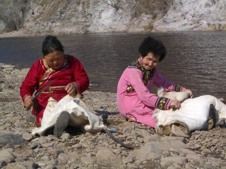 鄂倫春人過(guò)去在家庭公社“烏力鄰”里,同生產(chǎn)共消費(fèi),在當(dāng)時(shí)生產(chǎn)力十分低下的情況下,憑著扎槍和弓箭,單個(gè)人很難獲得能夠滿足衣食需要的獵物,必須要有“烏力鄰”全體成員的通力合作,才能戰(zhàn)勝兇猛和龐大的野獸,所以,在“塔坦達(dá)”領(lǐng)導(dǎo)下的集體狩獵是當(dāng)時(shí)最主要的勞動(dòng)形式。隨著生產(chǎn)力的不斷發(fā)展和個(gè)體小家庭的大量流動(dòng),不僅社會(huì)組織“烏力鄰”由原來(lái)血緣性的家庭公社演變?yōu)榈鼐壭缘牡赜蚬?,勞?dòng)組織也隨之發(fā)生了極大的變化。集體狩獵已不再是“烏力鄰”傾巢出動(dòng),而是由幾個(gè)小家庭的成員自愿結(jié)合成“安嘎”來(lái)進(jìn)行。同時(shí)還出現(xiàn)了集體和個(gè)人等多種勞動(dòng)形式。狩獵也不再單純是為了滿足衣食的需要,剩余獵物可以拿去交換,獵產(chǎn)品已趨于商品化。故此時(shí)一些珍貴的細(xì)毛皮張和藥用價(jià)值較高的獸類(lèi),成了鄂倫春人主要的狩獵目標(biāo)。這樣就形成了一年中的四個(gè)狩獵旺季,即:農(nóng)歷正月至2月是“鹿胎期”;4月至6月是“鹿茸期”;9月至落雪為“叫鹿尾期”;落雪后至來(lái)年開(kāi)春是“打皮子期”。大概是源于原始的圍獵,鄂倫春人把狩獵叫“打圍”,而這四個(gè)狩獵旺季就叫“紅圍期”。“紅圍期”除“叫鹿尾期”外,都組織“安嘎”集體出獵?!鞍哺隆笔且环N臨時(shí)性的狩獵組織,狩獵旺季將臨時(shí),由一人發(fā)起,串聯(lián)幾位親朋好友或志趣相投的人組成一個(gè)“安嘎”,待獵期結(jié)束,“安嘎”自行解散,下次出獵時(shí)再重新組合,因此其成員并不是固定的(圖為熟化狍皮,吳雅芝攝影)。