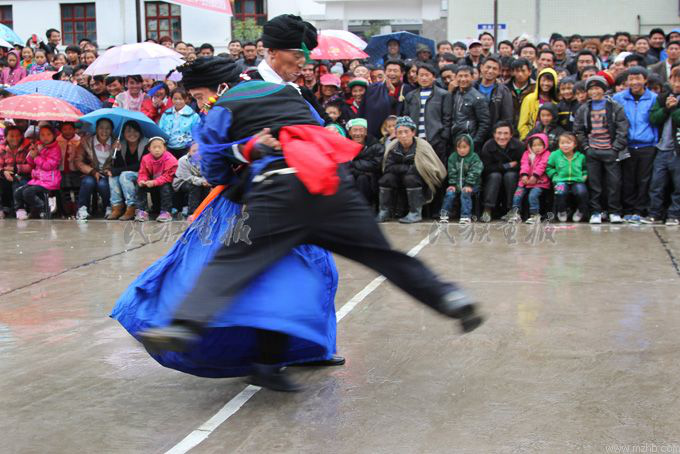 蹲斗,彝語叫“互布吉則”,意思是雄雞斗架。勞動之余,男子常進行蹲斗比賽。雙方各為一、兩人。兩手合掌并于胸前,呈半蹲狀態(tài),相互用左肩撞右肩,或右肩撞左肩,不準用手推;以碰撞使對方的手、臀部先著地為贏。另一種比賽方法是蹲著繞圓圈或走“之”字形,參加人數(shù)不限,以堅持時間最長為勝。