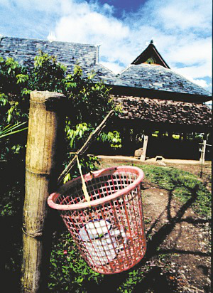 時(shí)常徜徉在傣族園里的我,一日忽然發(fā)現(xiàn)曼乍村每戶人家的院門上都掛了一個(gè)籮筐,筐里放了一個(gè)碗或是口缸大小的器皿,里面盛著些水,水里泡著一片有刺的葉子。每個(gè)從外面進(jìn)家的人,來(lái)到院門前都要拿起那片帶刺的葉子蘸一下器皿里的水,往自己頭上左右抖抖,動(dòng)作舉止頗為奇異。