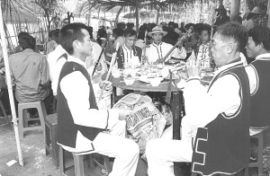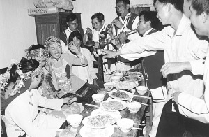 接著婚宴開始,八音隊(duì)吹奏的樂曲優(yōu)美動(dòng)聽,大家喝喜酒祝賀新郎、新娘;同時(shí),男方家的帶娘給女方家人開檳榔碗。開檳榔碗的順序是女方家人由老到小分別接檳榔碗,意在感謝女方長輩、親屬對(duì)新娘的養(yǎng)育之恩。