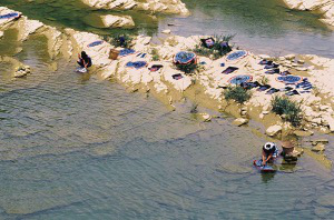 女人在潺潺溪流的大青石上晾好衣裙后,會在溪水中嬉戲