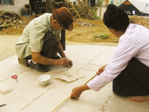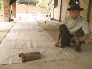 言談間,巖妞把制好的竹環(huán)放入早已畫好的同心圓圖案中的小圓上,只見竹環(huán)大小正好與小圓吻合。巖妞說,圖案外側(cè)的大圓便是擺放棉紙用的。接著,他把手中厚厚的幾張棉紙圍繞著已經(jīng)放入圖案中的竹環(huán)依次擺入,直至擺滿。在同心圓圖案的上側(cè),巖妞還畫了一個(gè)寬與同心圓圖案的直徑相符的矩形圖案,把棉紙鋪滿其中。巖妞說,這圖形就是“貢菲”的高度。制作的最后一道程序,是把棉紙用漿糊粘合起來。陰干后,一個(gè)“貢菲”就做好了。