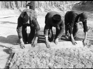 這時(shí),亞生已經(jīng)開(kāi)始了第二步,他把彈好的羊毛鋪勻,開(kāi)始噴灑開(kāi)水。只見(jiàn)他熟練地把水噴向羊毛,然后和妻子一起快速把簾子卷好,用羊毛繩綁緊,再用腳踏著卷好的簾子在平地上來(lái)回踏蹬,這樣不停地重復(fù)后,做成了氈坯。亞生停下來(lái)解開(kāi)簾子,拉平氈坯,修整好邊角,又灑上熱開(kāi)水,把氈坯卷起,這是工藝最關(guān)鍵也是最后一步——他們一起跪在簾上,用雙臂反復(fù)搓滾氈坯,感覺(jué)已經(jīng)平整了,夫婦倆又齊心協(xié)力把氈坯展開(kāi)拉平,放到院子里。此時(shí),亞生長(zhǎng)出了一口氣,抹抹頭上的汗說(shuō):“晾干了就可以賣了!”