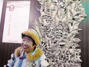 在展廳里,幾位來(lái)自黑龍江的手工藝人還現(xiàn)場(chǎng)展示了魚(yú)皮制作技藝。64歲的劉升從事魚(yú)皮制作已近20年,被評(píng)為黑龍江省工藝美術(shù)大師。她告訴記者,赫哲族過(guò)去主要用魚(yú)皮制作衣服,現(xiàn)在則用魚(yú)皮制作各種工藝品、小掛飾。在她身后,掛著一張長(zhǎng)兩米多、寬約1.5米的魚(yú)皮畫(huà)《還魂薩滿》,展示了赫哲族神話傳說(shuō)中的圖景,有薩滿、有森林、大鳥(niǎo)和各種圖騰,充滿了原始而神秘的氣息。劉升說(shuō),這還只是未完成的作品,但已用了3000多張大馬哈魚(yú)皮。