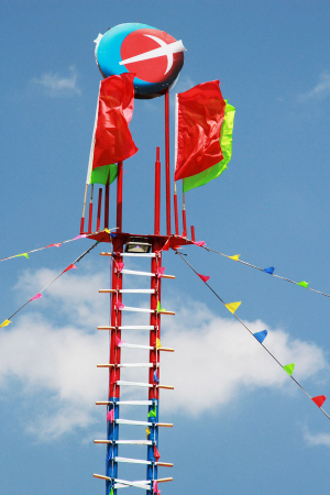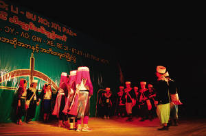 2011年,緬甸傈僳學會在密支那舉辦了第一屆世界傈僳闊時節(jié),第一次將十幾米高的弩弓木雕作為會徽。該木雕高高聳立于密支那郊區(qū)闊時節(jié)會場,還有印有傈僳族徽的紅旗插滿會場四周,高高飄揚,與巨型木雕相互輝映,構(gòu)成了一個以弩弓木雕為核心,族徽紅旗環(huán)繞的闊時節(jié)會場空間。其內(nèi)其外,傈僳族空間與非傈僳族空間區(qū)隔明顯。
