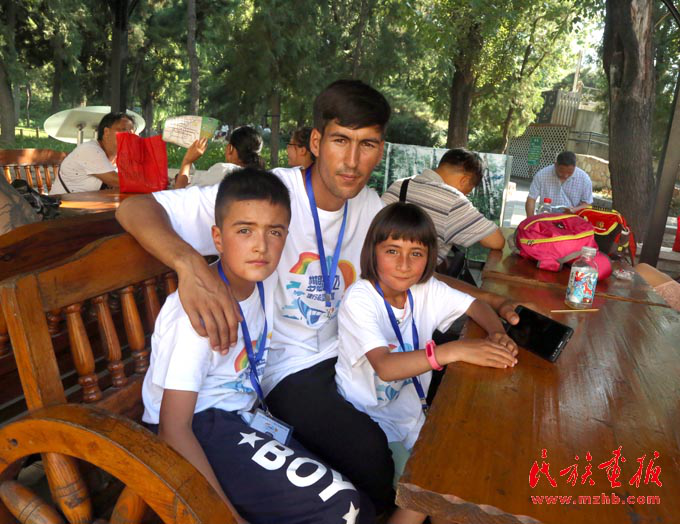 在全國各地的支援下,塔吉克族學生和老師有機會走出大山,出外看看,這是師生三人在北京(娘吉加 攝影)