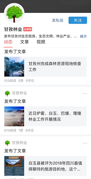 甘孜州林業(yè)局先后啟動甘孜林業(yè)無線站點、甘孜林業(yè)微信平臺、甘孜林業(yè)頭條號及甘孜林業(yè)新浪微博的建設(shè)運(yùn)營,這些平臺推送均選取編輯與群眾生活息息相關(guān)、群眾喜聞樂見的資訊,旨在打造甘孜州林業(yè)局官方權(quán)威信息發(fā)布渠道,樹立新時代中國林業(yè)新媒體發(fā)展新形象。