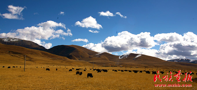 甘孜州的藍(lán)天白云、安詳牧群,金黃色西洋油畫般的美景吸引著八方游人(民族畫報社 列來拉杜攝影)