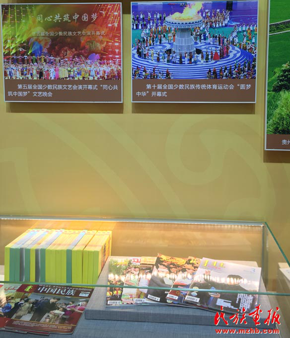 2017年,在“砥礪奮進的五年”大型成就展上展出的《民族畫報》六種文版期刊以及《民族畫報》記者拍攝的反映民族工作成就的圖片