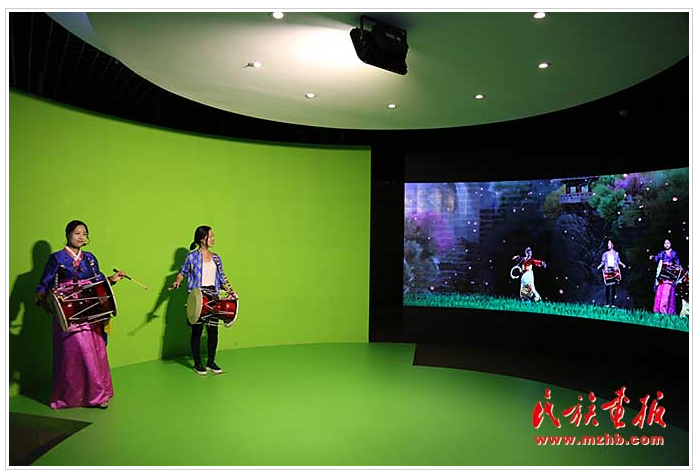 在長鼓舞體驗區(qū),參觀者紛紛走到長鼓前,隨著熒屏上顯示的節(jié)奏與動作提示,體驗長鼓舞的高雅飄逸,另一側(cè)大屏幕上,顯示出相應(yīng)的歌曲與舞蹈