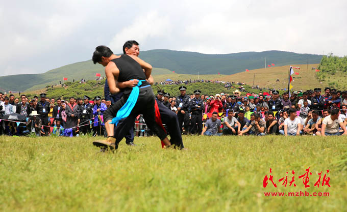 節(jié)日里舉行的彝族式傳統(tǒng)摔跤“格”是全國少數(shù)民族傳統(tǒng)體育運動會的比賽項目,很受彝族群眾喜歡