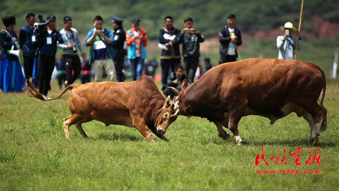 在力量與勇氣展示項目中,最激烈的賽事當數(shù)斗牛、斗羊,兩頭斗志昂揚的公牛在草地上激烈地用牛角頂著對方,發(fā)出響亮的牛角撞擊聲。斗羊場的激烈在于,兩只公羊在相互頂撞前,往往后退十幾米,方便加速,增加頂撞時的力量,羊角碰撞的聲音清脆響亮,久久回蕩在賽場上空。圍觀的人們里三層外三層地圍著,緊緊跟著對壘中的牛羊一起移動,跑著跳著在一旁高聲吶喊。