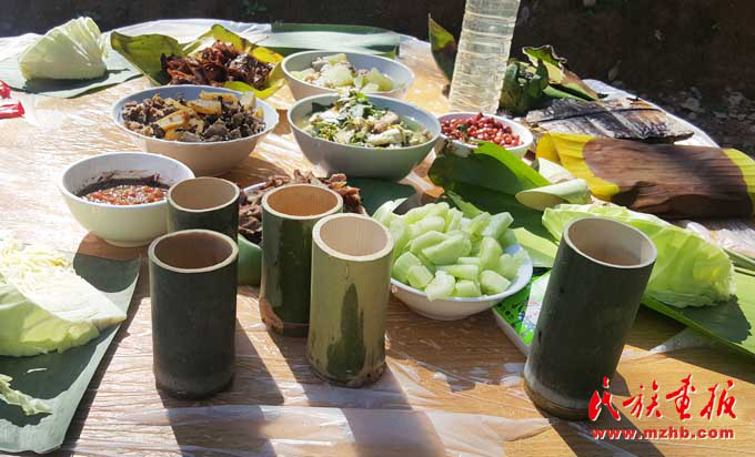 基諾族地區(qū)食材豐富,一日三餐,以大米為日常主食,雜以玉米、瓜豆等。每年5—9月的雨季,基諾山漫山遍野是食材,山藥、水芹菜、竹筍、魚腥草及各種菌類等無污染且很新鮮,是難得的烹飪材料,經(jīng)過簡單處理就成為餐桌上的美味佳肴?;Z族民間有句俗話,叫“漢炒、傣蘸、基諾舂”,也就是說漢族人喜歡吃炒菜,傣族的菜喜歡蘸著調(diào)料吃,基諾族的菜則以臼舂為主。基諾族的肉類的吃法較多,可以腌成干巴,也可吃新鮮的。酸腌魚、涼拌茶也是基諾族的最愛,基諾人做飯就餐均在竹樓二層的火塘周圍進行,有一定的禮節(jié)和講究。基諾族吃飯時,主人首先要在火塘東側(cè)獻一點飯菜祭祀祖先和灶神,吃飯時全家人按順序在火塘旁圍蔑桌而坐,家長正對火塘,客人靠火塘而坐。