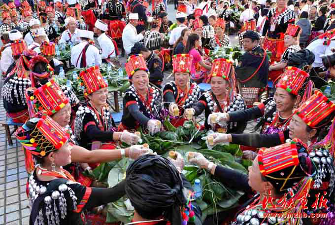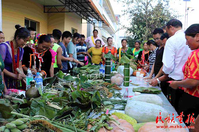 尚立文向記者介紹說:“以前景頗族過年,大年三十,一部分男人在家殺年豬,其余的就上山打獵。景頗族很慷慨,凡是獲取到的獵物,見者都有份。女人除了在家準(zhǔn)備年夜飯,也會(huì)上山或下壩子采野菜等。但不管是打獵的還是摘野菜的,都必須在太陽落山前到家,闔家歡度春節(jié)吃年夜飯。現(xiàn)在生活好了,不打獵不摘野菜了,但還是得遵循太陽落山之前到家的習(xí)俗?!?/p>