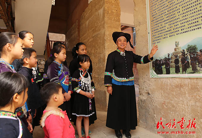 “女子太陽山祭祀”州級傳承人陸順梅(右一)帶著小朋友參觀“女子太陽節(jié)”展覽,并為小朋友講解壯族文化并為小朋友講解壯族文化