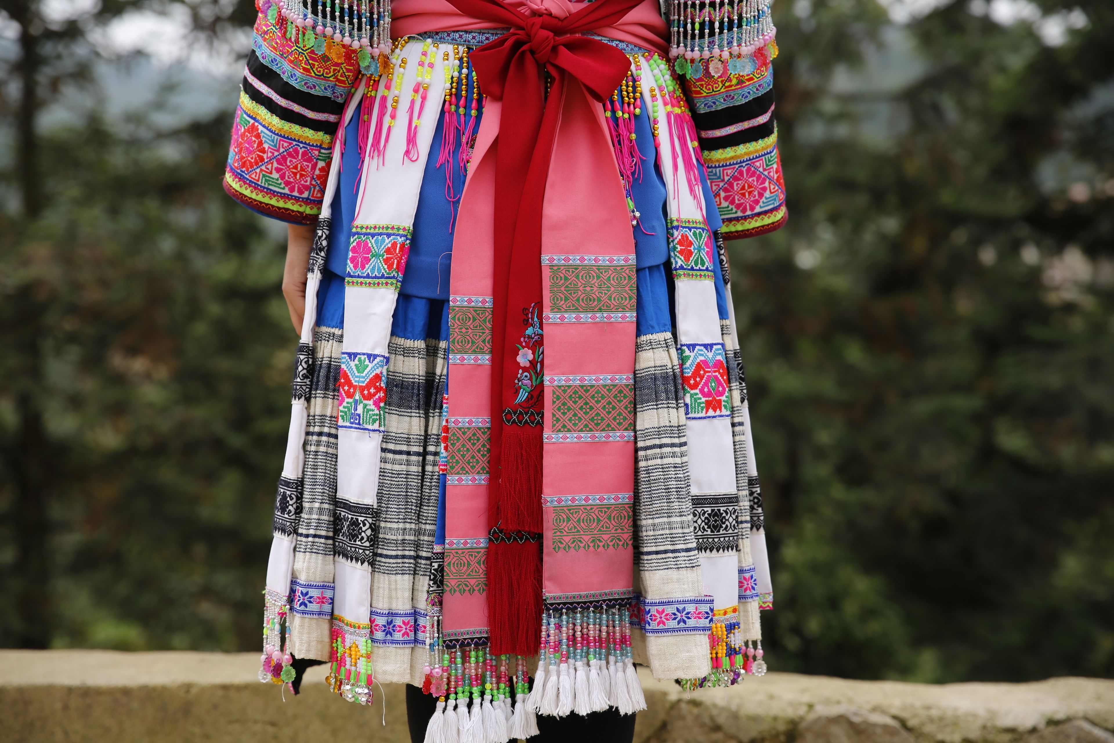 圖片說(shuō)明:貴州貴陽(yáng)苗族女子服飾花帶百褶裙