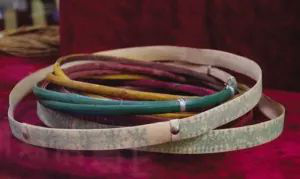 直到今天,腰箍仍在德昂族服飾中占有重要位置。按德昂人的習慣,姑娘成年后,就要在腰部佩上若干腰箍。這些腰箍大多用藤篾編成,藤圈寬窄粗細不一,有的漆成紅、黑、綠等色;有的刻上花紋,包上銀皮、鋁皮;還有的一半是藤篾,一半是銀絲。姑娘們以腰箍多、腰箍美為榮。因此,在戀愛期間,小伙子為了討姑娘歡心,往往費盡心機地制作精巧的腰箍相贈。腰箍從傳說的用來“拴住人”,演變成為用來“拴住心”。