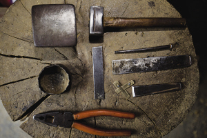 制蘆笙的幾個關(guān)鍵技術(shù)活——安簧片、點鉛、校音等工序,得由楊枝光親自上。他從工具箱里翻出一只薄薄的銅片,先是湊近看了看,中指輕彈了銅片后把它放到耳朵邊聽,似乎覺得聲音不太悅耳,于是又把銅片放在砧上用鐵錘敲打,再看、再彈、再聽……反復(fù)四五遍后,他總算滿意了,這才把銅片粘在笙管底端開口處。裝入簧片,蘆笙才算安裝好。
