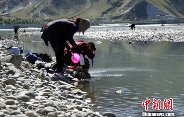 初秋的拉薩多了些許涼意,傍晚清澈的拉薩河水流潺潺,微風(fēng)輕拂,人們或舉家外出,或呼朋引伴,帶著毯子、新衣、酥油茶、牦牛肉,漫步至附近的河邊沐浴。