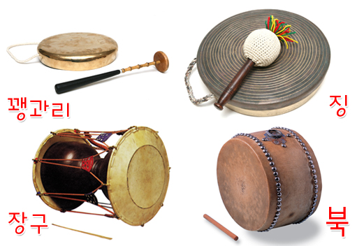 “四物樂”,朝鮮語為????。四物樂是由韓國著名民俗家沈雨晟先生命名的,20世紀90年代傳入我國吉林延邊朝鮮族自治州?!八奈飿贰庇尚¤專???)、鑼(?)、長鼓(??)、圓鼓(?)四種樂器演奏音樂,并且由此音樂來做游戲。每種樂器都是以大自然的聲音來形成的。小鑼象征風,長鼓象征雨,圓鼓象征雷,鑼象征電。