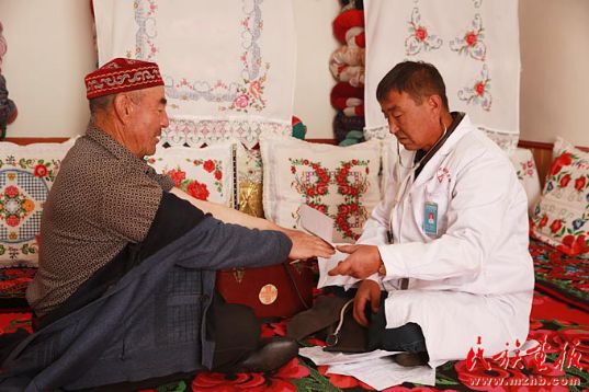 居馬泰·俄白克多年的恩師阿吾爾達(dá)·合德爾現(xiàn)在也是他的病人,這位80多歲的老人向記者說道居馬泰·俄白克翻雪山、過冰河,無數(shù)次遇險,但他仍在堅持。把我們這些患者當(dāng)作家人對待。學(xué)生時代的居馬泰·俄白克就是思想積極,熱心善良的好孩子。工作后獲得榮譽受到習(xí)總書記的接見,回到工作崗位上,很多牧民騎馬趕來看望他,他就利用這個機會向牧民宣傳黨的惠民政策、民族團(tuán)結(jié)和健康保健等知識?!?/p>