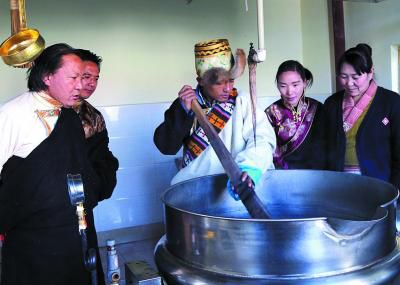 該遺產(chǎn)項(xiàng)目代表性傳承人明珠(左)指導(dǎo)瀧沐覺堪(制藥師)煎熬“五味甘露”。關(guān)確才讓 攝