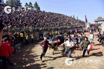 貴州省從江縣第十五屆原生態(tài)侗族大歌節(jié)的前一天,恰逢該縣逢亥斗牛日,丙妹鎮(zhèn)松學(xué)斗牛塘、谷坪鄉(xiāng)四寨河斗牛塘同時(shí)舉辦傳統(tǒng)牛王爭(zhēng)霸賽,喜迎一年一度“侗族大歌節(jié)”的到來,共有來自周邊村寨的80頭水牯牛參戰(zhàn),斗?;顒?dòng)場(chǎng)上名牛角逐,場(chǎng)面異彩紛呈,吸引數(shù)萬名觀眾前來觀戰(zhàn)。