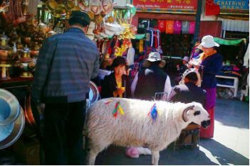 在西藏的許多寺廟及附近,常常會有單獨的、或三三兩兩的脖頸上系著紅布條沒有主人的羊只。主人把它們放生,使它們重歸自然,成為自由的羊,免去了挨宰遭殺之罪。習慣上,這些羊就叫做放生羊。轉經(jīng)人會自覺自愿給它們吃的東西,它們不會為肚子饑餓而亂躥。也許正因為如此,這些放生羊才會顯得非常乖巧溫順。