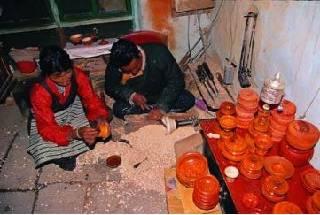 木碗的來源,一是西藏自己生產(chǎn)的,還有一種是云南迪慶生產(chǎn)的,都是從西藏的市場上交換或購買的。西藏林芝地區(qū)的朗縣、察隅,山南地區(qū)的加查、隆子、錯那,阿里地區(qū)的噶爾等地均產(chǎn)木碗。其中尤以錯那生產(chǎn)的“察牙”木碗和噶爾生產(chǎn)的“堆旭”木碗最負盛名。以上木碗的原料選擇樹根或樹瘤車制而成,選料之講究,做工之精細,使好木碗的花紋各異,或磷火紋,或豬鬃紋,或貓頭鷹眼紋,這些木碗都很名貴,與普通木碗之間的價格也很懸殊,一個上等木碗價值10頭牦牛,一般人家是不敢問津的,但也盡量想方設法弄個像樣的,以慰平生。