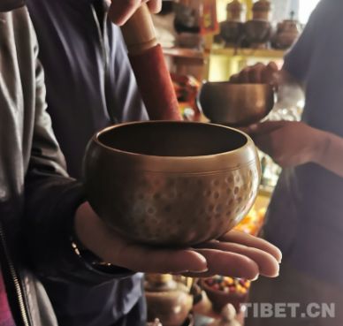 圖為一家商店中游客正在體驗sing bowl