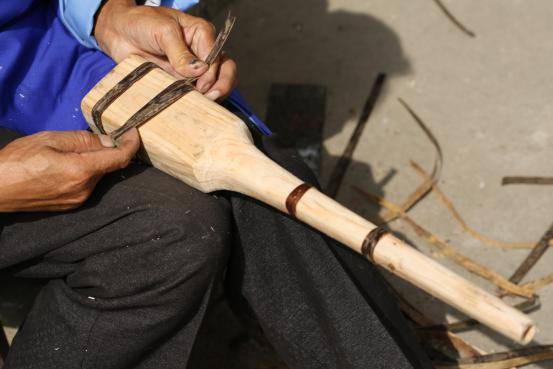 制作蘆笙大的工序有12道,再細一點有幾十項。如第一道是到山上去選竹子,拿尺子慢慢比劃,三拳的有多長,要很細心地選,確實可以用。取下來之后,第二道工序是拿到河邊去洗,用紗布搓。因為竹管有很多斑點,關節(jié)處有很多毛,要很細致的把那些東西全搓掉。弄好之后用太陽曬,曬干曬白。第三道工序,就是取杉樹的木頭做笙斗,計劃好做三拳的是多少公分,四拳是多少公分。十二道工序,后面越學越復雜,每一道工序都很講究。