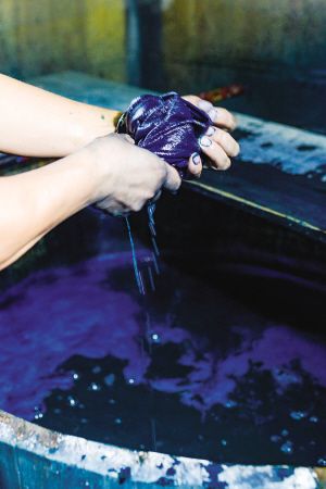 藍(lán)靛染布是一項(xiàng)古老的工藝,是白褲瑤服飾文化的重要組成部分。白褲瑤婦女用藍(lán)靛草來(lái)提取染布用的靛泥,隨時(shí)染藍(lán)、青棉線和青布??p制衣物的白棉布用藍(lán)靛這種天然染料染色,其色澤與一般的機(jī)織布印染有所不同。2018年8月拍攝。