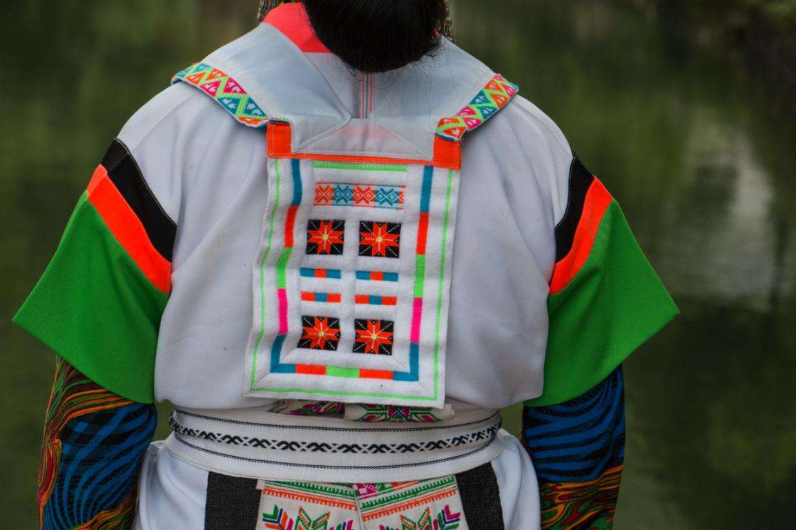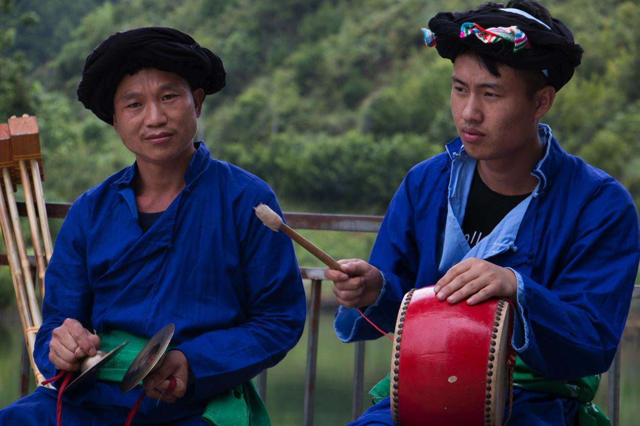 改毛村苗族村民的傳統(tǒng)服飾至今保留完好,而且現(xiàn)在村內的苗族人都還有穿著本民族傳統(tǒng)服飾的習慣。改毛村的苗族男性一般頭戴黑色絲帕裹成的帽子,絲帕里裹有彩色絲巾。穿著藍色打底的斜襟長衫,腰部系有綠色腰帶。