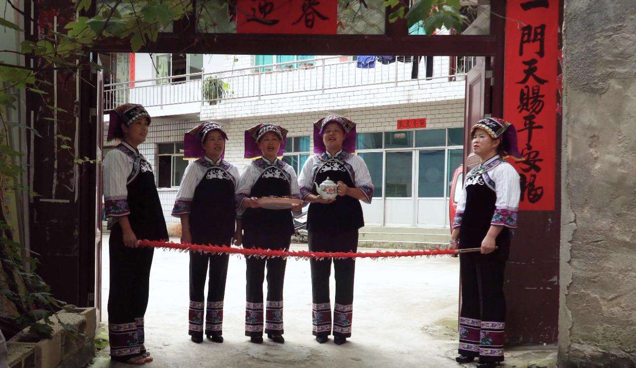 紅星村村內(nèi)布依族村民保留有布依族傳統(tǒng)服飾,在日常生活中也還有穿著布依族服飾的習(xí)慣。紅星村布依族女性服飾做工精細(xì),款式多樣。老人頭戴黑色圓帽,上身主要穿著灰白色斜襟上衣和青藍(lán)色打底的圍腰,上衣領(lǐng)口至兩肩處繡有大面積花紋圖案,圍腰上部也繡有花紋圖案作為裝飾。圍腰上的兩條絲帶系于身后,絲帶上繡有花紋圖案。下身穿著灰色長(zhǎng)褲。