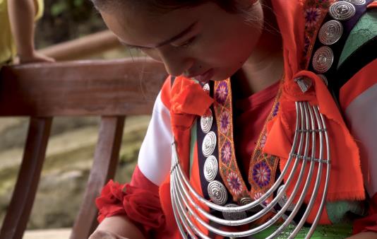 谷灑村苗族服飾上的圖案,呈現(xiàn)多元化的風(fēng)格,這是因?yàn)槊缱迮拥姆椡汲鲎运齻冏约旱氖种?,每件服飾都有著個(gè)人風(fēng)格。谷灑村苗族喜歡在古井的涼亭上刺繡,這里涼風(fēng)習(xí)習(xí),是她們納涼刺繡最好不過(guò)的地方。同伴坐在一起,這樣以便于互相指點(diǎn),學(xué)習(xí)對(duì)方的長(zhǎng)處、彌補(bǔ)自己的短處。