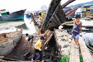 三亞漁港社區(qū)疍家人的孩子在沉船遺址玩耍(2007年攝)。