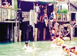 三亞疍家人昔日賴以生存的“疍家棚”,全家老小吃住都在一個棚里。孩子們戲水游玩就在疍家棚前,熱鬧非凡(1997年攝)。