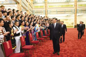 演出開始前,習(xí)近平等黨和國家領(lǐng)導(dǎo)人會見了文藝會演演職人員代表、組委會成員、56個民族的優(yōu)秀基層黨員代表等,并同他們合影留念。