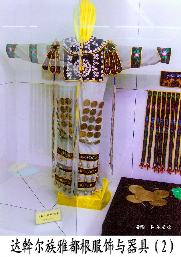 在達斡爾族人部分轉(zhuǎn)向農(nóng)業(yè)生產(chǎn)后,他們的觀念意識也發(fā)生了一些變化,雅德根服飾隨之有所演變,雙肩的鳥使者為布谷鳥所替代,成為春天的使者,神肩上360個海貝飾品表示360天,24條長短飄帶象征農(nóng)歷的24個節(jié)氣 。