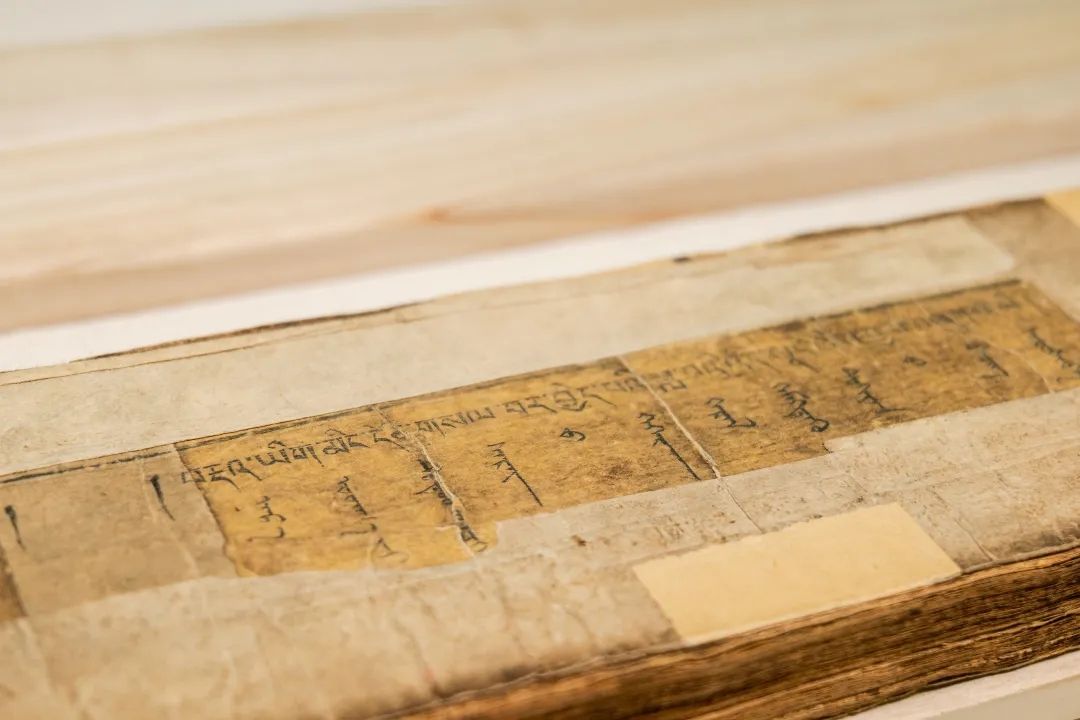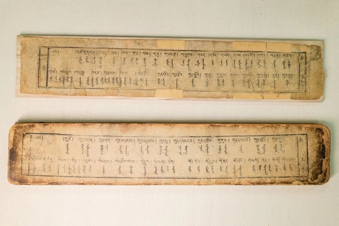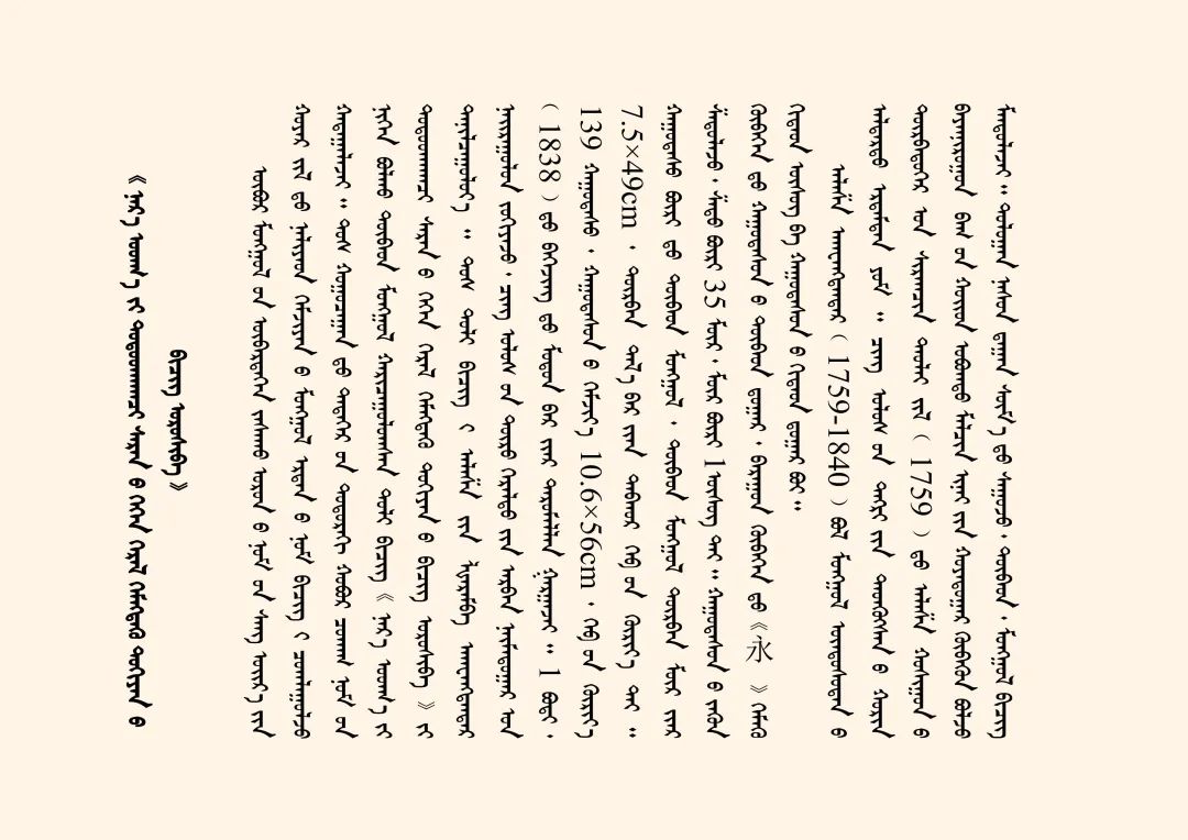 藏蒙對(duì)照詞典《詳解月光辭典》又稱《浩月輝映詞典》,該詞典由阿拉善拉隆巴阿旺丹德?tīng)柧幹宓拦馐四辏?838)北京嵩祝寺木刻本。1卷,139葉,頁(yè)面尺寸10.6×56厘米,版框尺寸7.5×49厘米,四周雙欄,梵來(lái)裝。每頁(yè)以藏蒙、藏蒙四行為階梯排列,每列35行,每行1字。頁(yè)面左側(cè)有藏文頁(yè)碼,右側(cè)有漢字《永》和漢文頁(yè)碼。