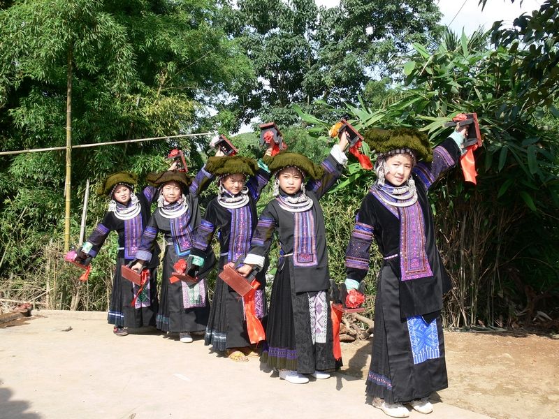 板凳舞,苗語(yǔ)稱(chēng):“卡牛檔”。關(guān)于它的起源,在黑苗中一直這樣流傳:相傳在很久以前,寨中的男子都參軍打仗去了,剩下老人、婦女和小孩,由于地處高山,深林密布,經(jīng)常有野獸出沒(méi),婦女們?yōu)榱藟涯懀滋焱砩隙枷矚g聚在一起,用小板凳互相擊打,敲出聲響,驅(qū)趕野獸……漸漸地,就慢慢演變成了在當(dāng)?shù)孛缱鍕D女生小孩辦滿月時(shí),拿小板凳敲擊舞蹈祝福小孩的習(xí)俗。