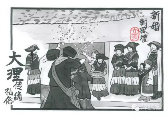 進(jìn)新郎家時(shí),新郎和新娘會(huì)對(duì)歌,新郎問新娘答,男女雙方一問一答,對(duì)歌后,方能入門。